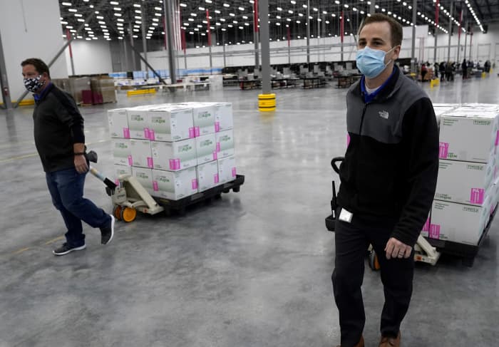In den USA werden all diese Ressourcen von der Regierung bzw. der Operation Warp Speed zur Verfügung gestellt. Die Distribution dieser Ressourcen wird für Moderna (und alle zukünftigen Partner der OWS) von McKesson übernommen.[88] In diesem System beinhalten alle Lieferungen des Moderna Impfstoffes auch direkt die nötigen Materialien zur Injektion der Impfungen. Auch an dieser Stelle umgeht Pfizer die Lieferkette der Regierung und liefert sogenannte „mega kits“ aus, die das nötige Zubehör zur Injektion von 1000 Dosen sowie Handschuhe zum Umgang mit Trockeneis beinhalten. Diese Zubehörspakete werden separat von den Impfungen verschickt.